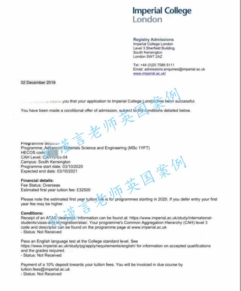 帝國理工錄取案例:高級(jí)材料科學(xué)與工程碩士,無雅思提前錄取