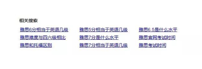 如果你用百度搜索雅思的話,跳出的相關(guān)搜索是這個(gè)樣子的: