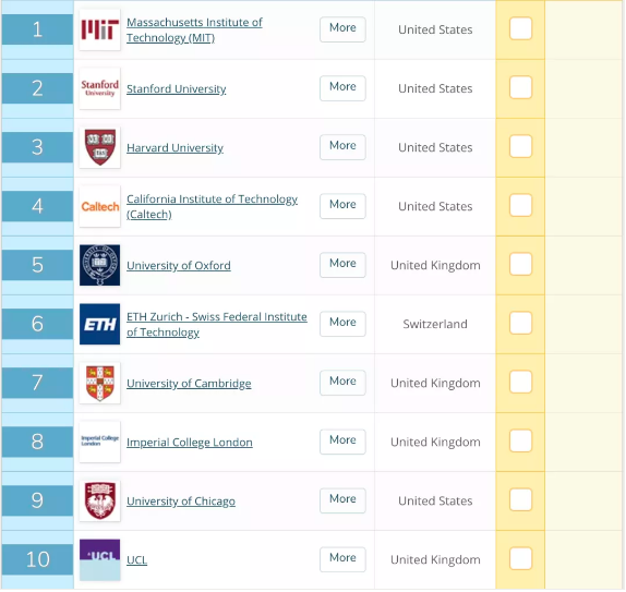 和去年一樣,今年的QS世界大學(xué)排行榜的前四名依然被美國大學(xué)包攬!斯坦福大學(xué)、哈佛大學(xué)、加州理工大學(xué)分列二到四名。多數(shù)美國大學(xué)的排名都有所上升。盡管目前,美國國內(nèi)情況不盡如人意,但依舊不能撼動美國大學(xué)在世界大學(xué)的頭部角色。美國依舊是多數(shù)渴求“前沿技術(shù)、思維”留學(xué)生的不二選擇。