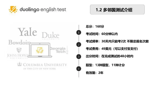 多鄰國是什么考試?多鄰國英語測(cè)試(Duolingo English Test)是一個(gè)在家既可完成的英語測(cè)試考試平臺(tái),為有留學(xué)計(jì)劃的學(xué)生提供語言水平證明。在完成測(cè)試的48小時(shí)內(nèi)就可以獲得成績。目前超過800所大學(xué)和暑期課程接受多鄰國成績。