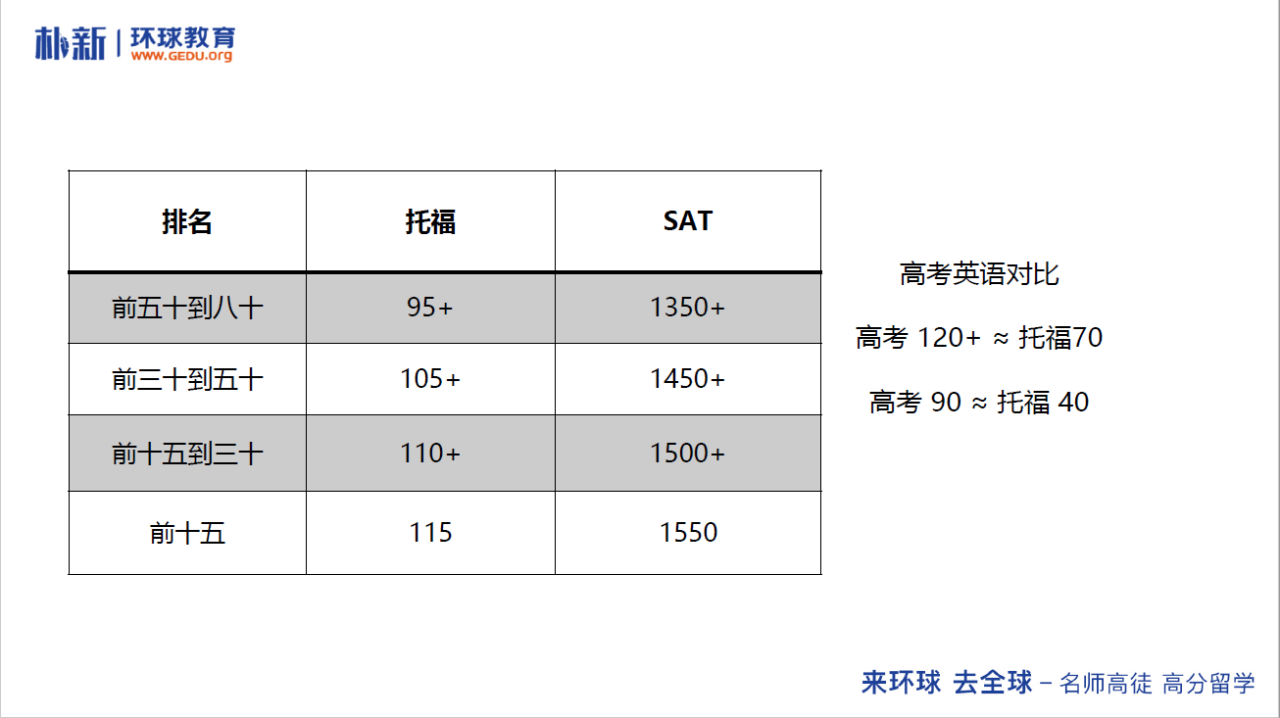 美本申請,考試是重中之重,不同排名的大學(xué)對于成績的要求也不統(tǒng)一,該如何去衡量分?jǐn)?shù)呢?五湖北美考試院美本培訓(xùn)項(xiàng)目主管陳老師主要為大家解決了這一部分的問題。根據(jù)院校排名為大家詳細(xì)的介紹了托福和SAT考試以及常規(guī)的成績對標(biāo),其中也包括托福和高考英語成績的對比: