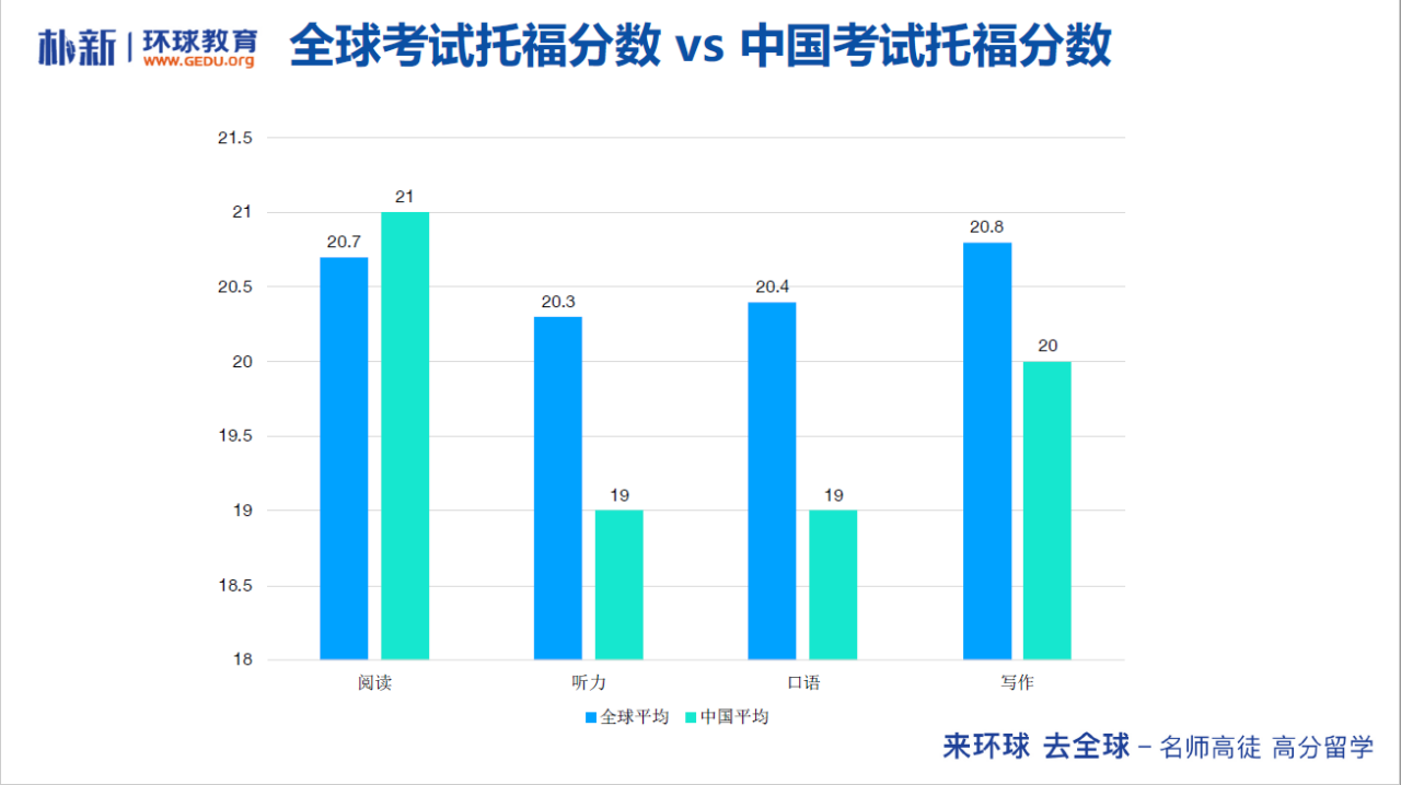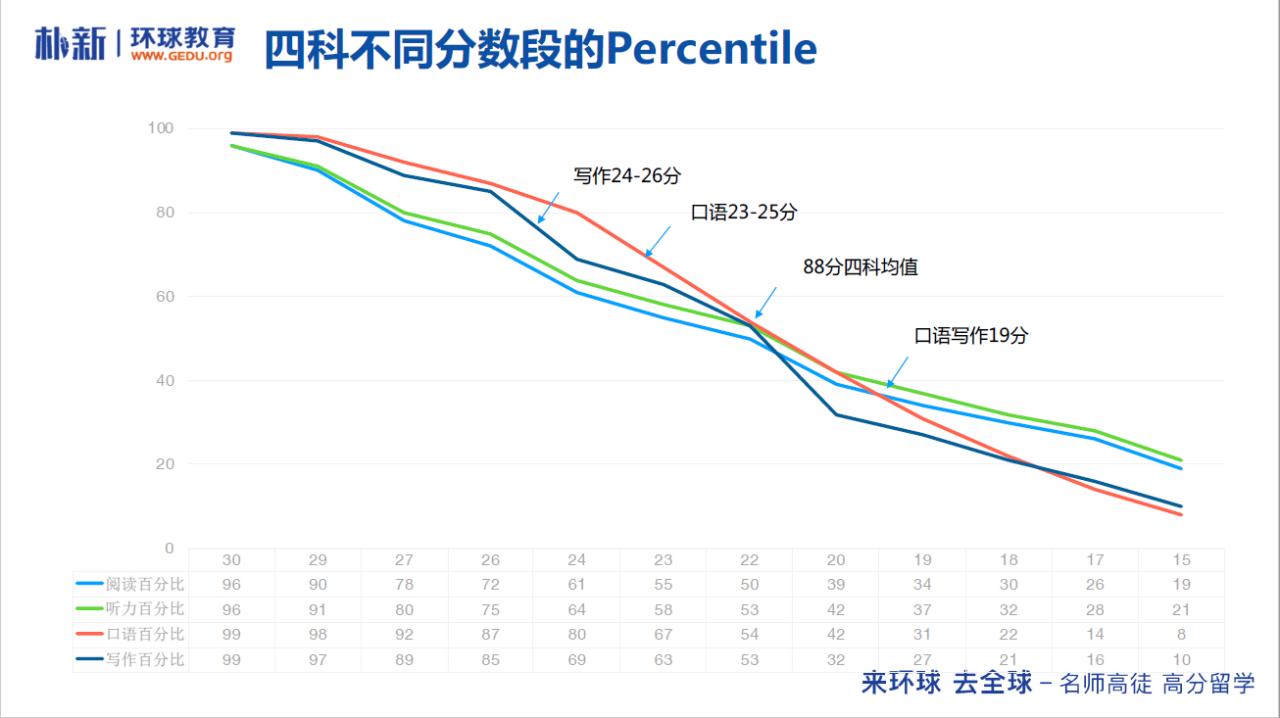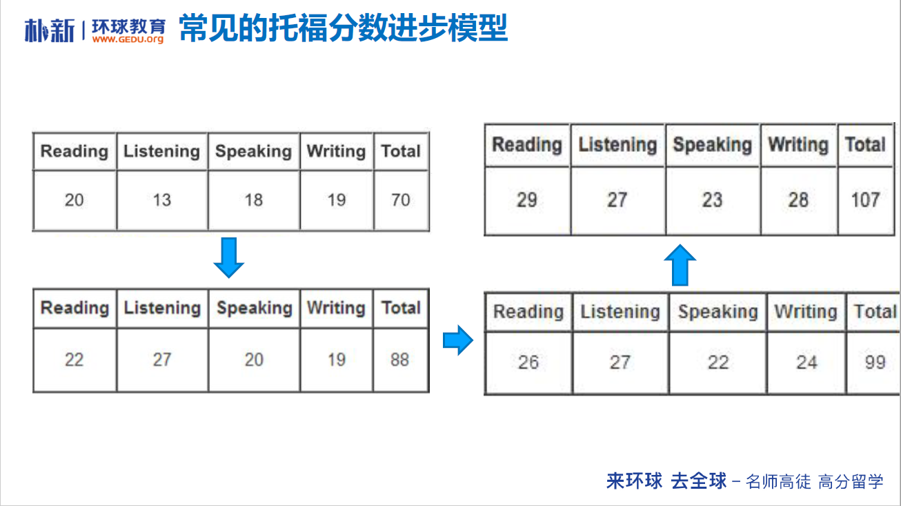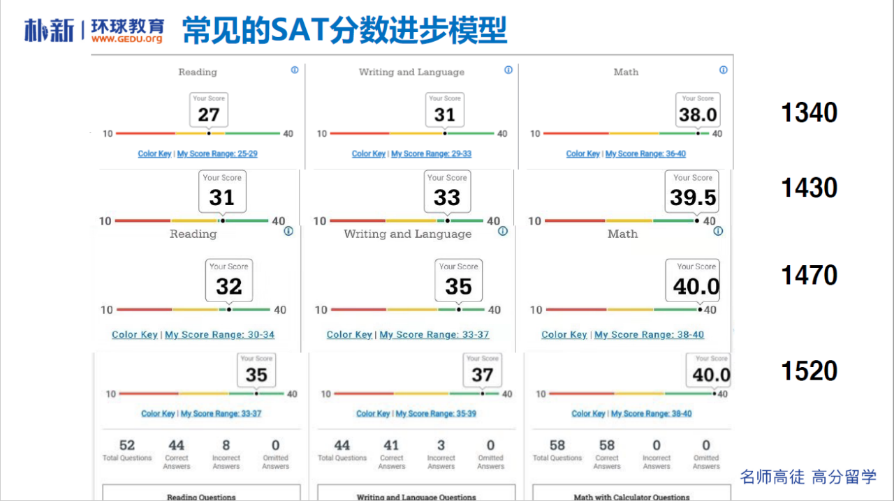 由以上兩張數(shù)據(jù)表格可以看出,在托??荚囍?,中國學(xué)生在寫作項(xiàng)還是具有明顯優(yōu)勢的,但是在聽力、口語和寫作部分還是有一定欠缺,針對這樣的情況,陳老師在講座中為大家介紹了常見的托福分?jǐn)?shù)和SAT分?jǐn)?shù)的進(jìn)步模型: