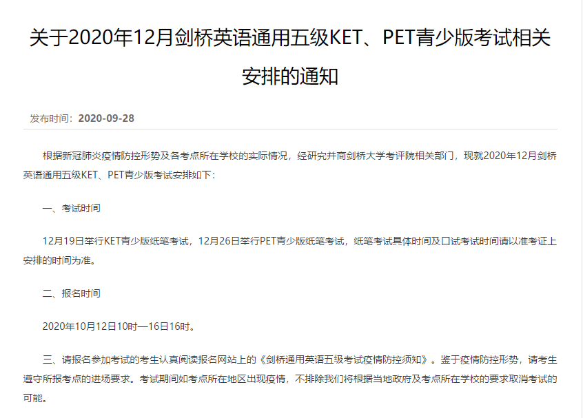 根據(jù)教育部考試中心官方消息,KET/PET(青少版)12月份考試將確認(rèn)恢復(fù),考試將在12月19日及12月26日舉行。筆試及口試的具體考試時(shí)間請(qǐng)以準(zhǔn)考證上時(shí)間安排為準(zhǔn)。