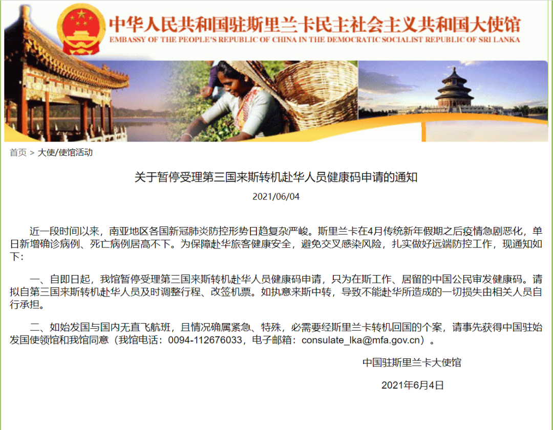 2021年6月4日,中國駐斯里蘭卡大使館暫停受理第三國來斯轉機赴華人員健康碼申請,只為在斯工作、居留的中國公民審發(fā)健康碼。