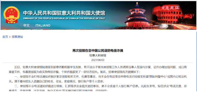 2021年6月3日,使館就近日接到旅意僑胞和留學生反映,有不法分子冒充使領館工作人員謊稱當事人在國內涉案、證件辦理出現(xiàn)問題等事件發(fā)布《再次提醒在意中國公民謹防電信詐騙》。請廣大旅意同胞提高防范意識,謹記“三不一多”原則,做到“未知鏈接不點擊、陌生來電不輕信、個人信息不透露、轉賬匯款多核實。”詳情登陸中國駐意大利大使館官網(wǎng)。