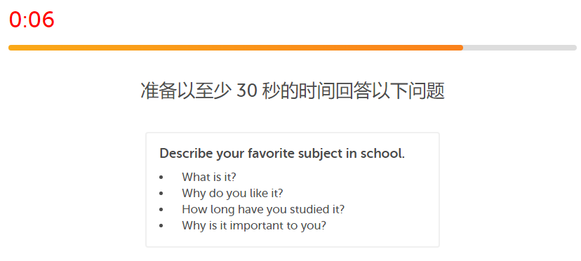 7. 小口語題,30秒的時(shí)間,根據(jù)主題和問題進(jìn)行回答(建議:提前準(zhǔn)備好一個(gè)喜歡的動(dòng)物,科目等,其實(shí)跟托福/雅思差不多;回答上就一個(gè)問題一句話,但注意別超時(shí))