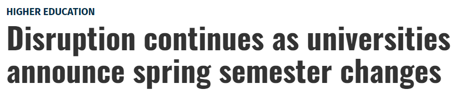因此許多大學(xué)再次改變了之前的春季學(xué)期安排,繼續(xù)線上遠(yuǎn)程授課,同時(shí)取消春假,并決定在線舉行畢業(yè)典禮。