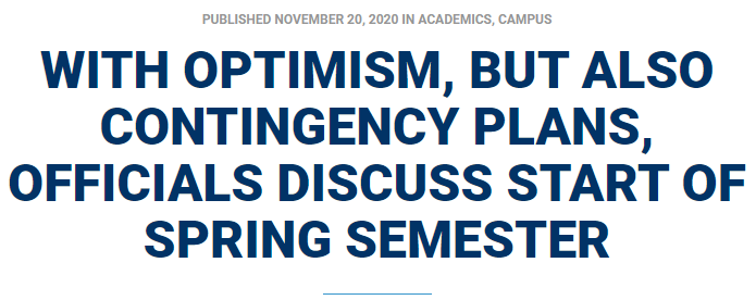 Francis在會(huì)議上說(shuō)到,如果春季學(xué)期開(kāi)學(xué)時(shí),情況好轉(zhuǎn),學(xué)校計(jì)劃研究生和專業(yè)學(xué)生于1月9日返回,而本科生于1月15日返回,所有學(xué)生在抵達(dá)校園后立即進(jìn)行COVID檢測(cè)。行政副校長(zhǎng)Kyle Cavanaugh表示,從1月9日開(kāi)始,每天將有1500個(gè)檢測(cè)名額。