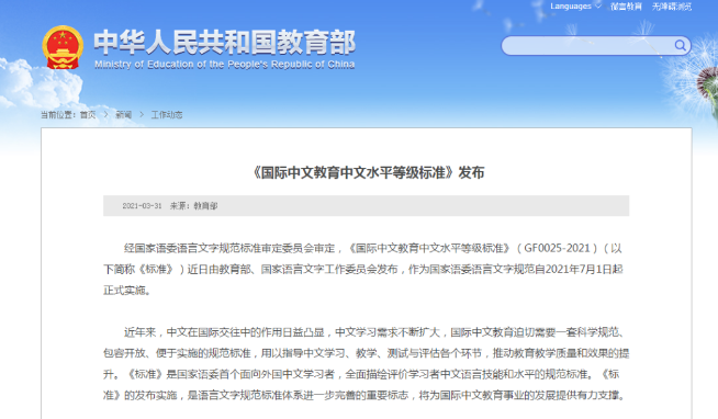 根據(jù)教育部網(wǎng)站消息,經(jīng)國家語委語言文字規(guī)范標準審定委員會審定,《國際中文教育中文水平等級標準》(GF0025-2021)(以下簡稱《標準》)近日由教育部、國家語言文字工作委員會發(fā)布,作為國家語委語言文字規(guī)范自2021年7月1日起正式實施。